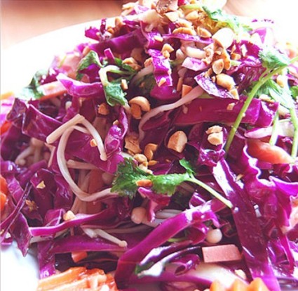 Purple cabbage shredded ham mushroom carrot parsley chopped peanuts garlic sauce vinegar salt pepper sugar chicken sesame oil chili oil